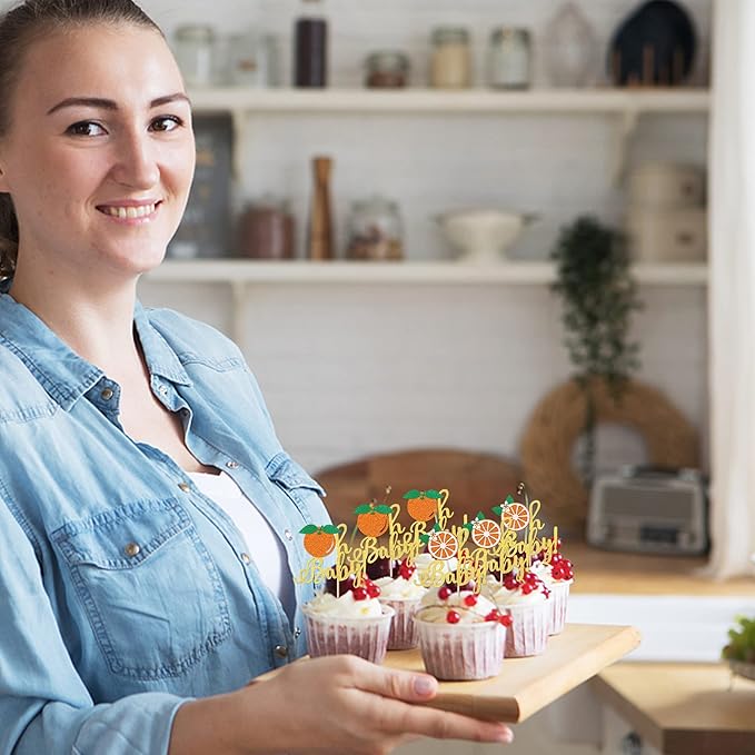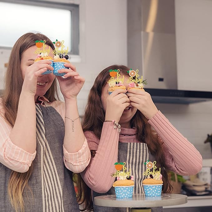 24 Pack Little Cutie Oh Baby Cupcake Toppers Glitter Orange Cupcake Picks for Citrus Theme Baby Shower Kids Birthday Party Tangerine Clementine Fruit Party Cake Decorations Supplies