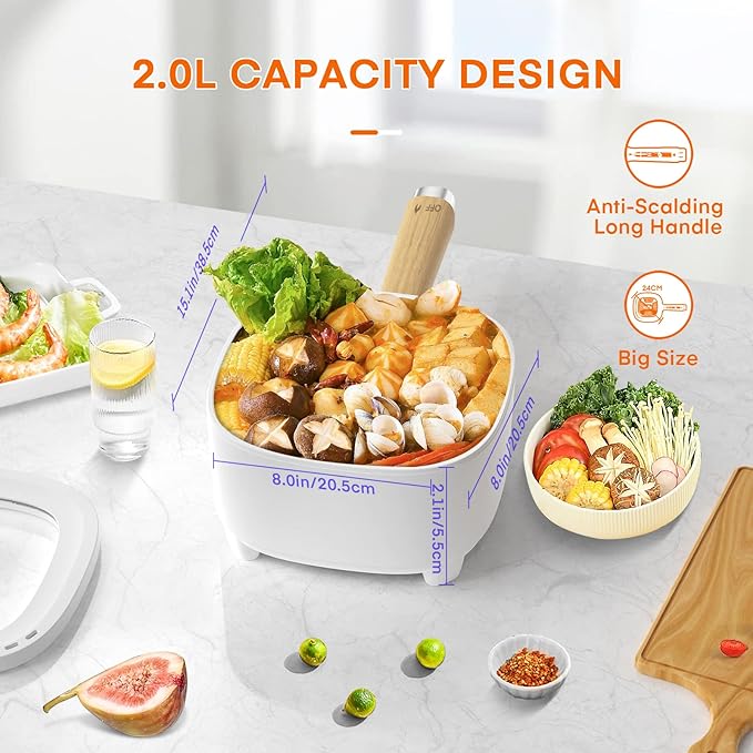 Audecook Hot Pot Electric 2L, Cermic Glaze Non-Stick Frying Pan 8 Inch, Portable Travel Cooker for Ramen/Steak/Fried Rice/Oatmeal/Soup, with Dual Power Control (Silicone Spatula Included)
