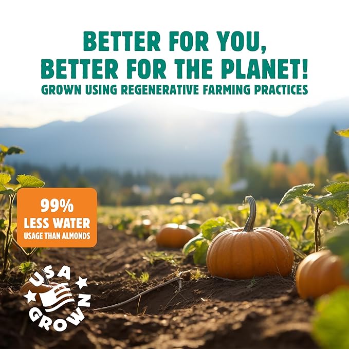 - PROUDLY GROWN & MADE IN THE USA - Most salted pumpkin seeds and sold today are imported—ours are American made, grown on U.S. farms using regenerative, organic methods that reduce water use, preserve soil health, and support biodiversity. We use 99% less water than almonds, rely on 100% organic inputs, rotate crops, avoid chemicals, and protect native pollinators. Nothing is wasted, and everything is done with care—from seed to soil to snack. You can taste the difference.