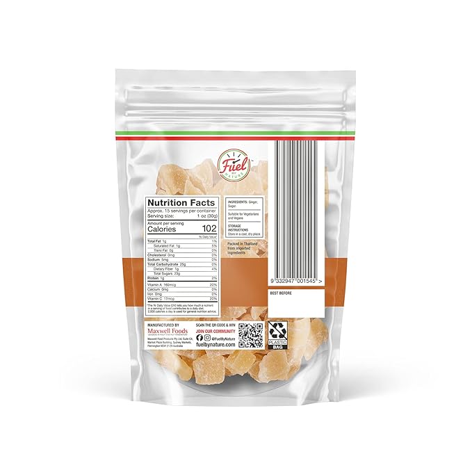- NATURAL, HIGH-QUALITY INGREDIENTS: A practical treat that tastes good and is good for you; Fuel by Nature Crystallized Dried Ginger contains no artificial colors or flavors; Natural source of energy and fiber