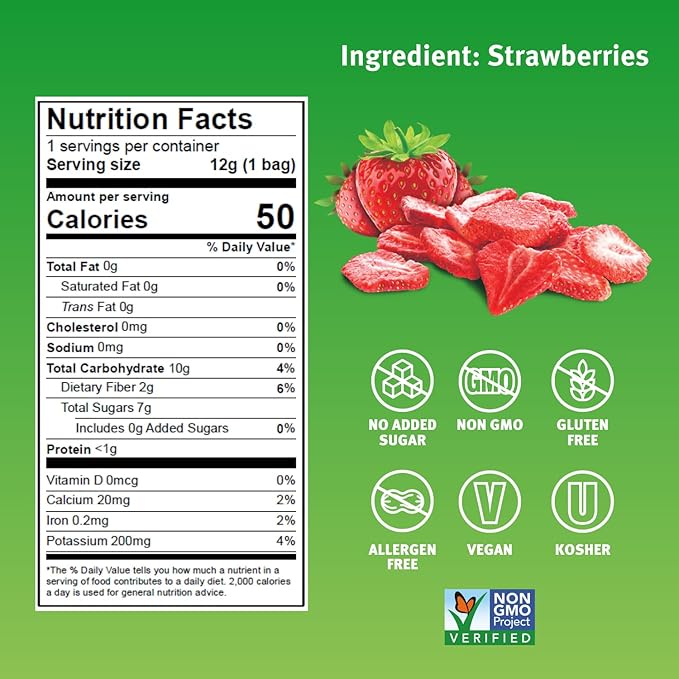 - CONTAINS: 12 convenient single-serve bags high-quality, freeze-dried Crispy Fruit Strawberries only contain one single ingredient, strawberries!