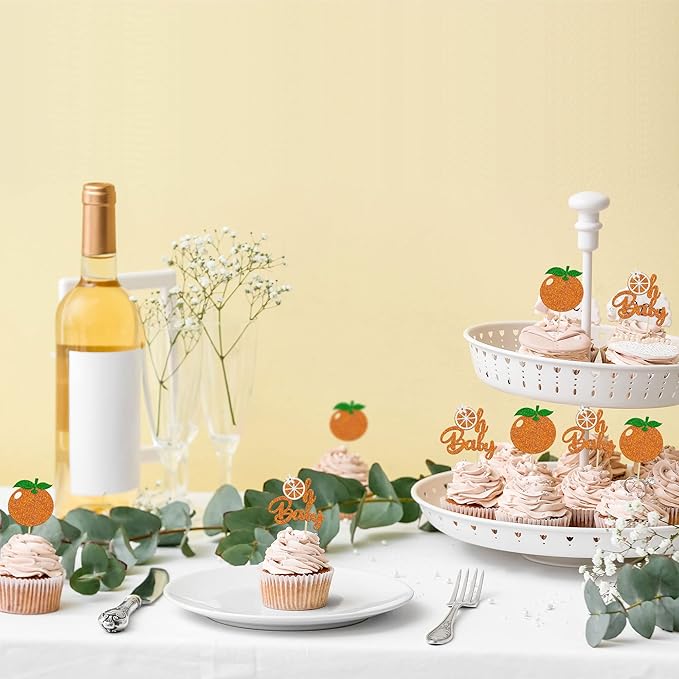 24Pcs Little Cutie Cupcake Toppers Glitter Orange Oh Baby Cupcake Picks Citrus Theme Baby Shower Decorations for Cutie Kids Birthday Party Baby Shower Gender Reveal Fruit Party Supplies