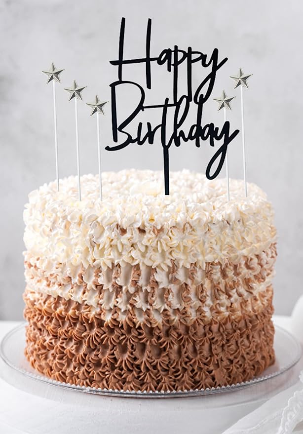Set of 1 Black Acrylic Happy birthday Cake Topper,5 pcs silvery Star Cake Cupcake Topper(Black 1)