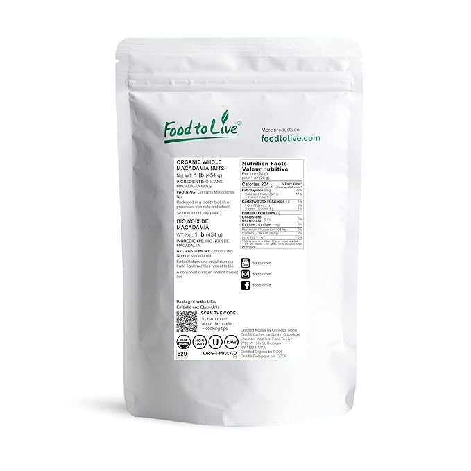 - ✔️ ORGANIC, NON-GMO, KOSHER, VEGAN: Food to Live Macadamia Nuts are USDA Organic and Non-GMO. Moreover, they’re Raw, Kosher, and suitable for Vegans.