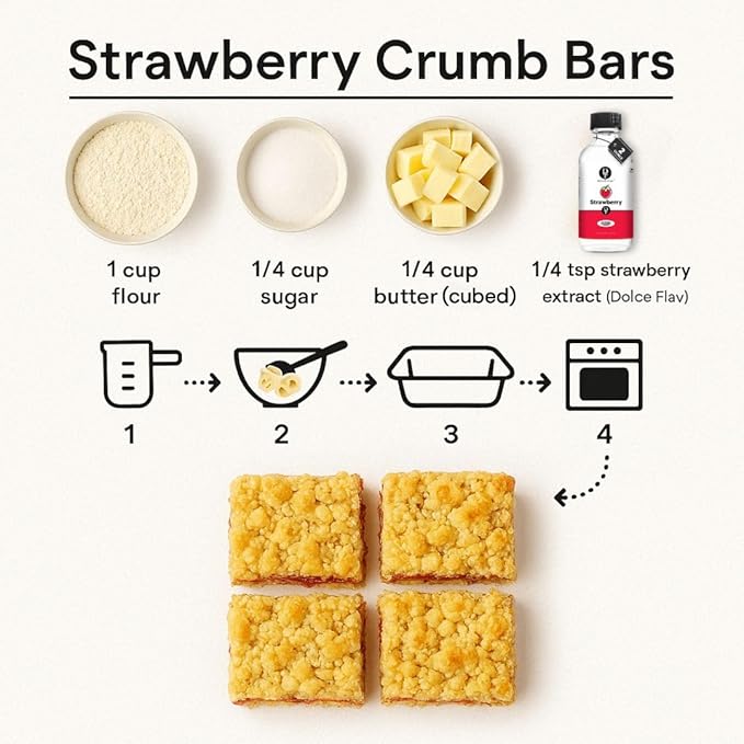 - Pure Strawberry Extract for Baking Delights: Elevate your baking creations with our strawberry flavoring. A quintessential ingredient for delightful strawberry shortcake, cookies, and pastries, it infuses your recipes with a fresh, fruity essence. Perfect for adding a strawberry twist to all your baking favorites.