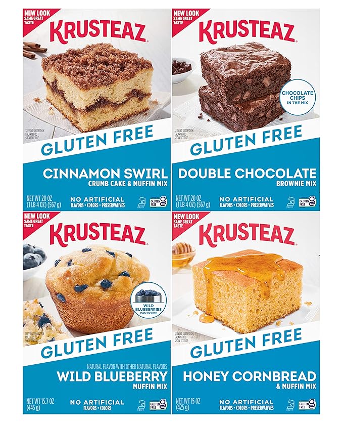 Krusteaz Gluten Free Baking Mix Variety Pack, 1 Cinnamon Swirl Cake Mix, 1 Double Chocolate Brownie Mix, 1 Wild Blueberry Muffin Mix, 1 Honey Cornbread Mix, (4 CT)