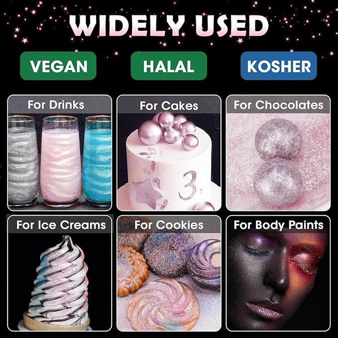 - ✔️【Vegan & Allergen-Free】Food-grade glitter uses only the highest quality vegan ingredients and does not contain common food allergens, including gluten, nuts or dairy products, so everyone can use and enjoy this product regardless of diet or food allergies. Unlike food contact glitter, these are 100% edible, so you don't need to worry about using them in your creations to make them sparkle for all.
