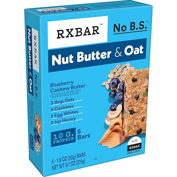 - Includes 6, 9.7oz boxes each containing 5 RXBAR Nut Butter and Oat Blueberry Cashew Butter protein bars; 30 bars total