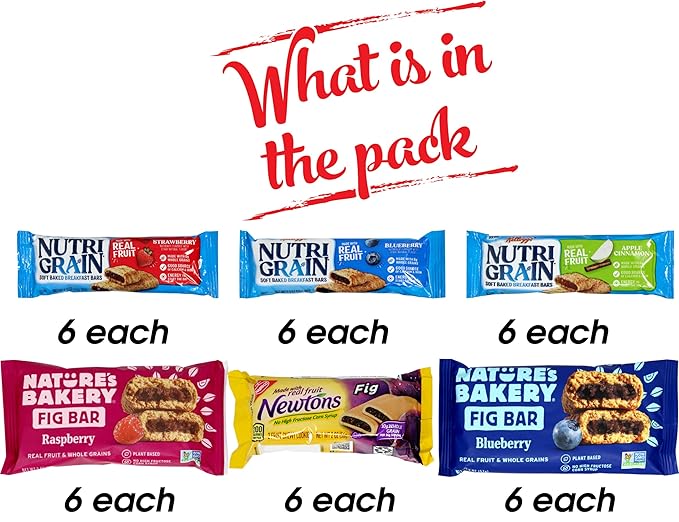 - Variety of Delightful Flavors - Enjoy multiple flavors with our fruit bar variety pack. 6 each of Nutrigrain strawberry, blueberry fig bars, Nutrigrain blueberry, apple bars Fig Newtons