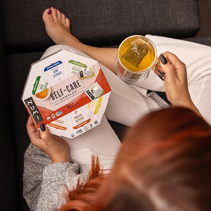 - Numi's Self-Care Sampler Contains 5 Teabags Each of: Immune Boost, Moroccan Mint, Dandelion Detox, Congest Away, Rooibos, Throat Soother & Immune Support set in an oxagonal gift box; No caffeine
