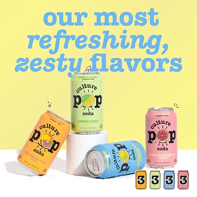 Culture Pop Soda, Zesty & Tarty Variety Pack, Probiotic Low Sugar Soda, Sparkling Juice Alternative, Non-GMO, Kosher, Gluten-Free, No Stevia (12pk)