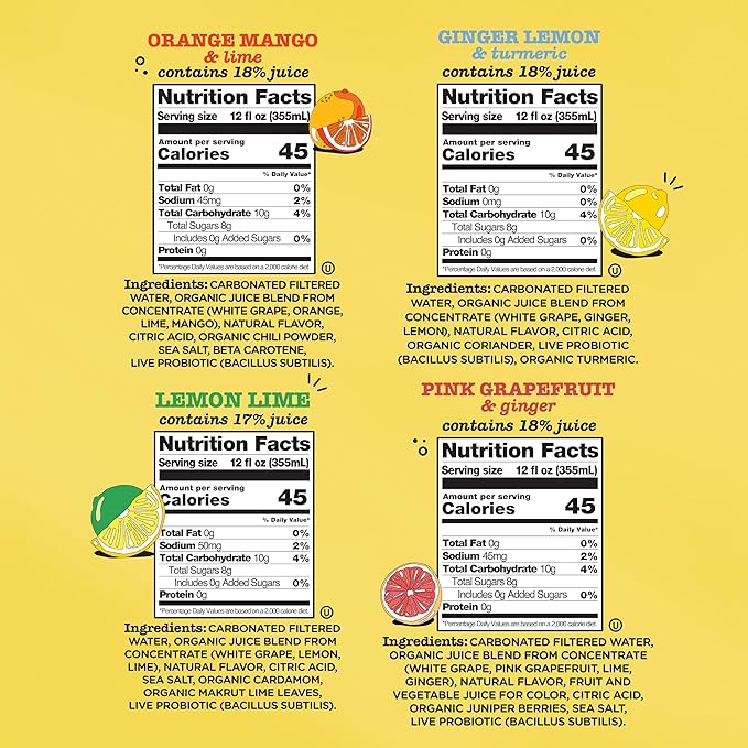 - Gut You Feelin’ Good: Each probiotic soda contains billions of CFUs of live probiotics at the time of canning. Each 12 oz can is 45-50 calories, 8-11g total sugar, plant-based, kosher, non-GMO, vegan, gluten-free. Contains no stevia or artificial sweeteners for a delicious, real flavor.