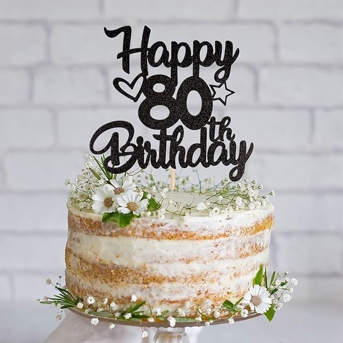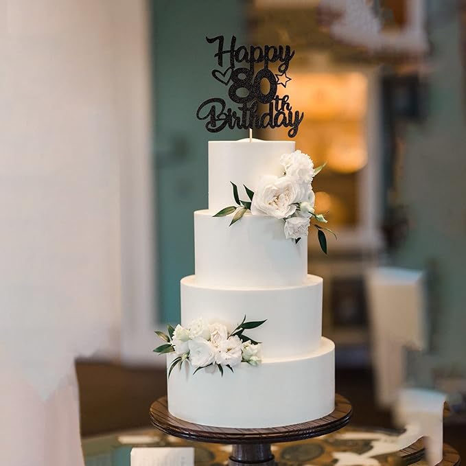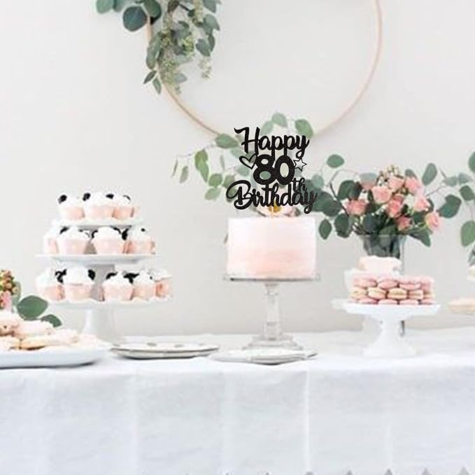 1 Pack Happy 80th Birthday Cake Topper Glitter Heart Star 80 Fabulous Cake Pick Birthday Sign Cake Decorations for 80th Birthday Theme Party Supplies Black