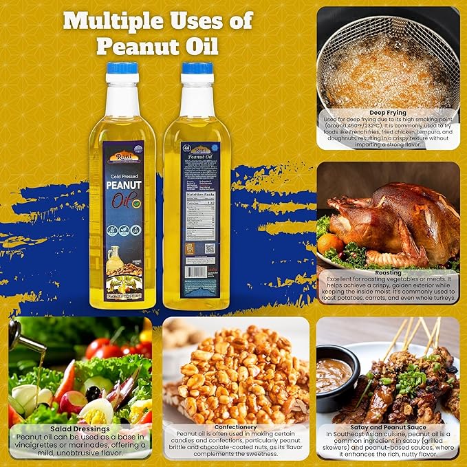 - ❤️COOKING: Peanut oil has a mild and nutty taste, making it excellent for deep-frying. Peanut oil is also one of the world’s traditional deep-frying oils because it can reach a high temperature 450°F) that keeps the outside of food crispy and the inside very moist. Adds a tasty and exotic element to recipes!