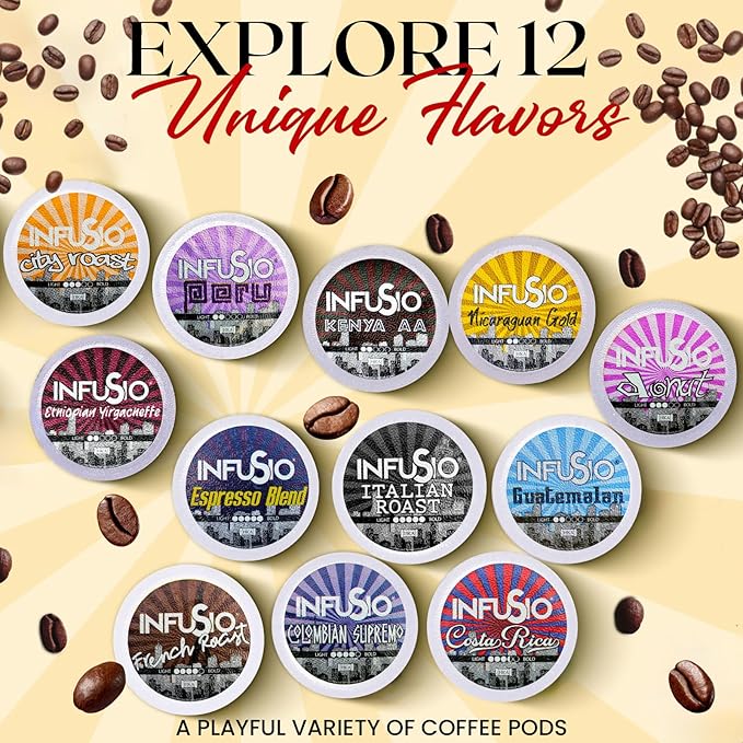 - 96 cups in 12 Unique Flavors of Premium Roasted Coffee --- we have MORE variety than any other brand on the market, with TWELVE different unique blends. Try them all, and if you like a certain blend more than others, check out our InfuSio brand store!