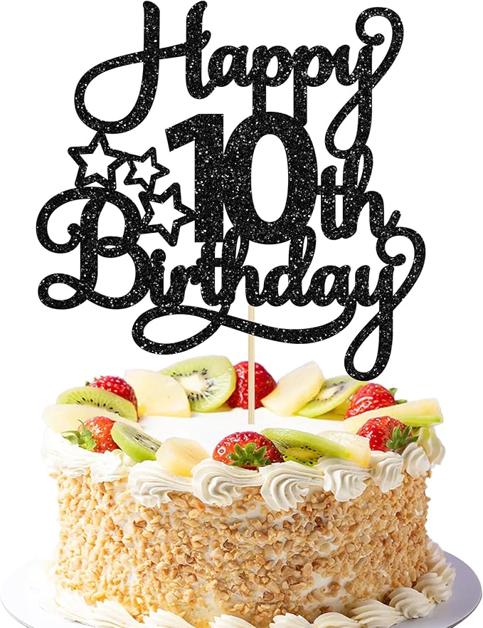 1 Pack Happy 10th Birthday Cake Topper Glitter Heart Star 10 Fabulous Cake Pick Birthday Sign Cake Decorations for Children 10th Birthday Theme Party Supplies Black