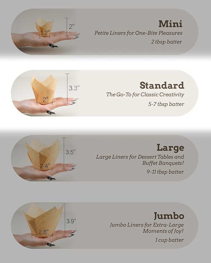 - Easy to use and Versatile: Tulip cupcake liners are a great choice to upgrade your cupcake. Compared with normal cupcake liners, tulip cupcake liners make cupcakes look more beautiful and fresh. Not only for cupcakes, but it's also a perfect baking holder for biscuits, tart, cookies, and brownies, all your consumers need to do is just to unfold the liner and enjoy the dessert. Let's prepare an impressive party for your family and friends with tulip cupcake liners!