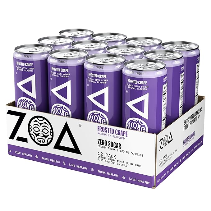 ZOA Zero Sugar Energy Drinks, Frosted Grape - Sugar Free with Electrolytes, Healthy Vitamin C, Amino Acids, Essential B-Vitamins, and Caffeine from Green Tea - 12 Fl Oz (12-Pack)
