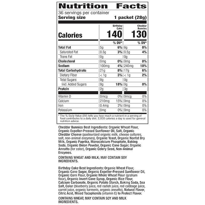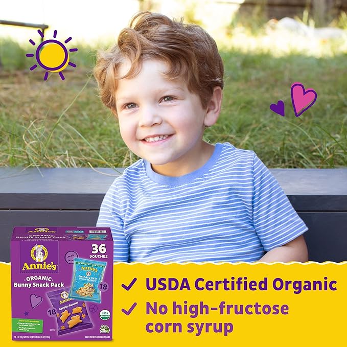 - CONTAINS: One 36 oz Annie's Organic Bunny Snack Pack with Original Cheddar Bunnies and Birthday Cake Bunny Grahams; 36 pouches total
