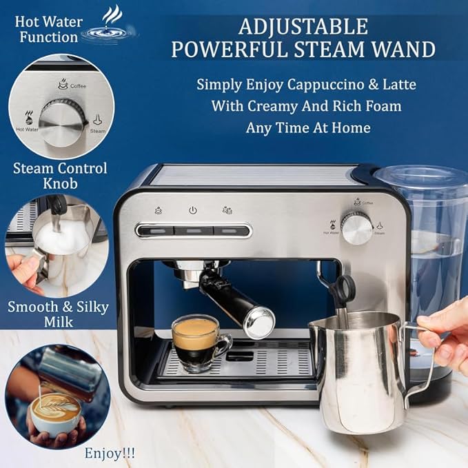 - Professional Espresso Machine: Our espresso machines for home are equipped with a 15-bar professional pump to ensure quality results every time. The 1450w powerful motor with adjustable controls allows you to customize your taste preferences for brewing your favorite espresso.