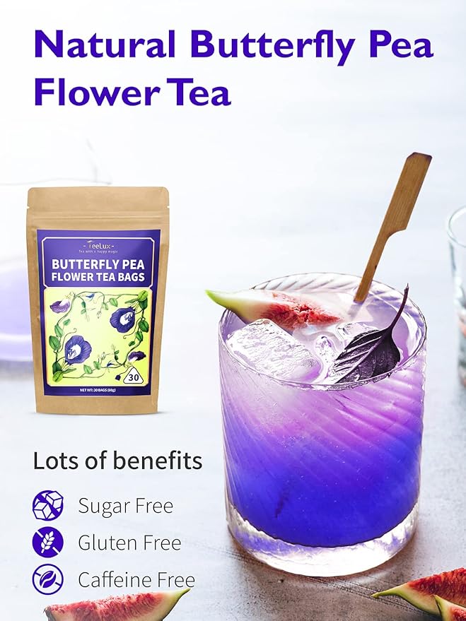 TeeLux Butterfly Pea Flower Tea Bags - Premium Dried Butterfly Pea Flower for Blue & Purple Drinks and Food Coloring, 30 Tea Bags