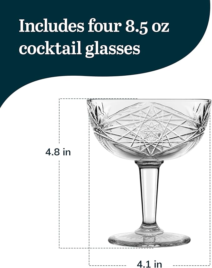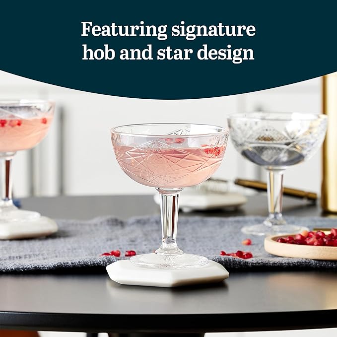 - Hobstar Coupe Drinking Glasses Set: Revisit the golden age of the cocktail every time you drink with the Hobstar champagne coupe glasses; the coupe glass set includes 4, 8.5-ounce coupe glasses
