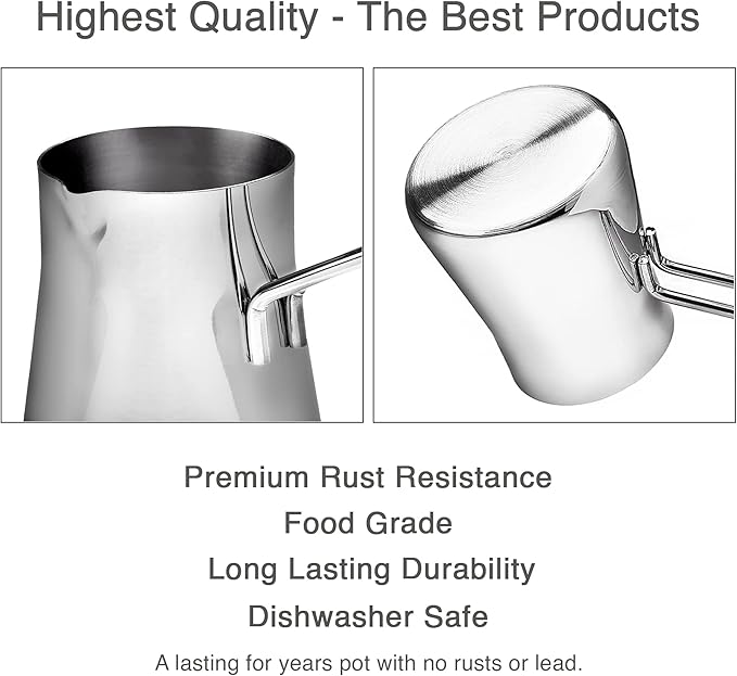 - EUROPEAN QUALITY STAINLESS STEEL: CRYSTALIA Turkish coffee pot made from high-quality rustproof 18/10 stainless steel that is completely food-grade material and much better than 201 steel material products.