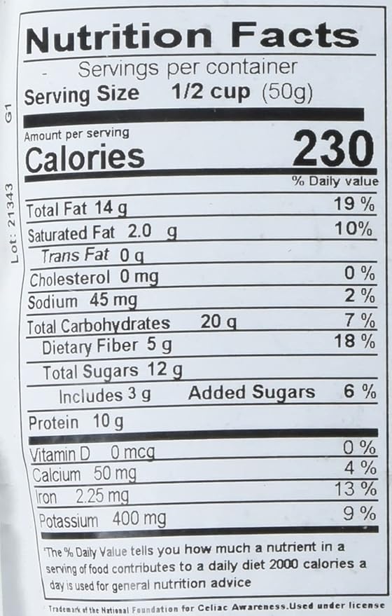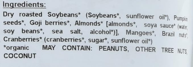 - A mix of colorful goji berries, cranberries, mangoes, crunchy Brazil nuts, pumpkin seeds, and almonds with savory tamari