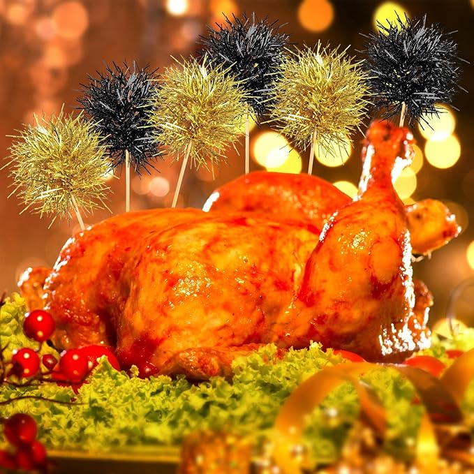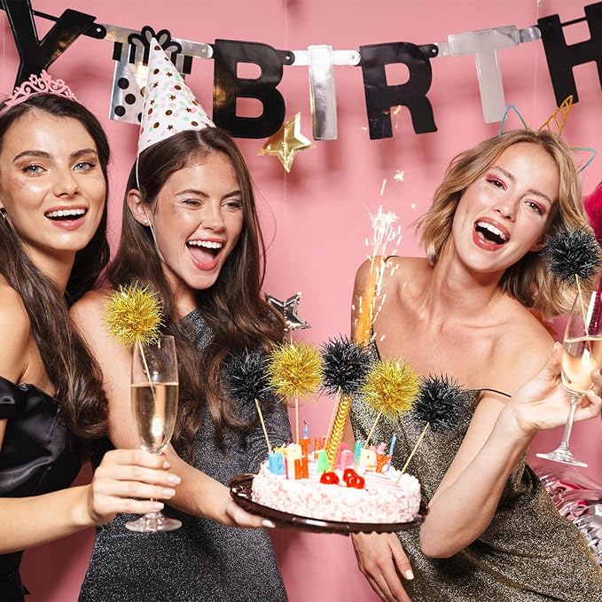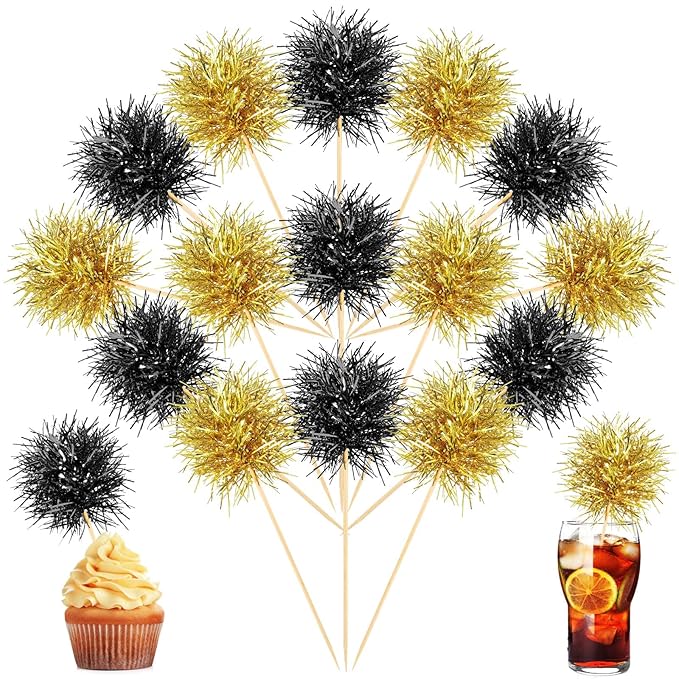 Chinco 100 Pcs Foil Firework Cupcake Toppers Sparkle Tinsel Cake Toppers Cake Decoration Cocktail Fruit Toothpick for Birthday Wedding Graduation Party(Black, Gold)