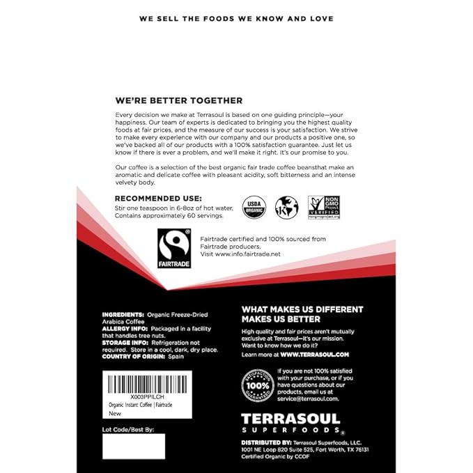 Terrasoul Superfoods Organic Freeze-Dried Instant Coffee, 3.5 oz - Fairtrade | Arabica Beans | Fresh Taste | Medium Roast