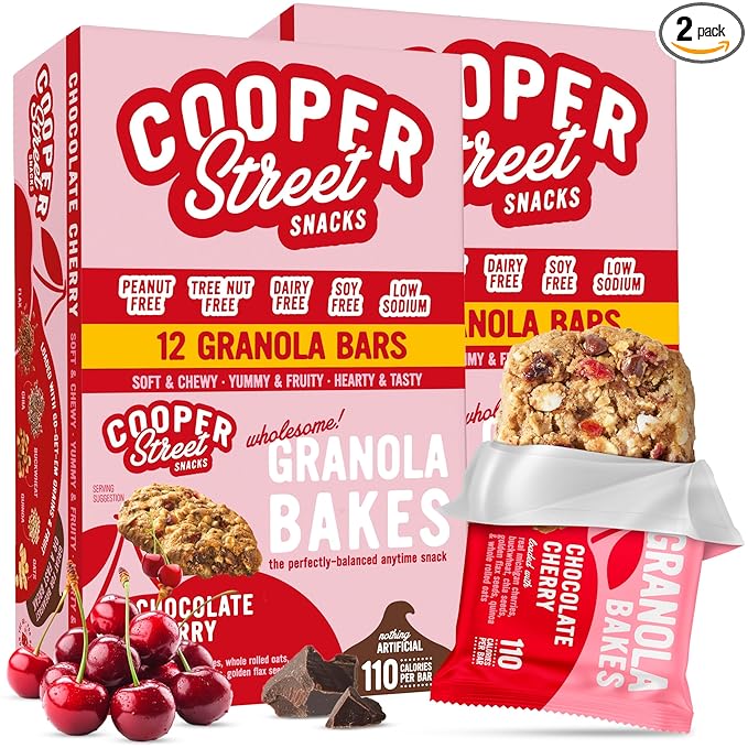 Cooper Street Chocolate Cherry Granola Bakes (24 pack) - Individually Wrapped Soft and Chewy Breakfast Granola Bars - Nut, Dairy & Soy Free - Great As Kids Snacks For School, Hiking Or Lunchbreak