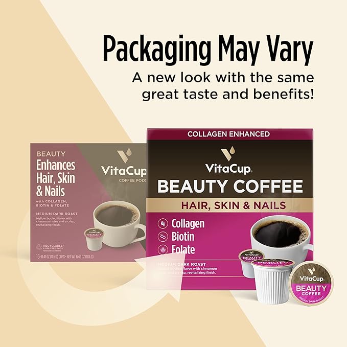 VitaCup Beauty Collagen Coffee Pods for Hair, Skin & Nails, with Biotin & Folate, Medium Dark Roast, Keto Friendly, Recyclable Single Serve Pod Compatible with Keurig K-Cup Brewers,32 Ct