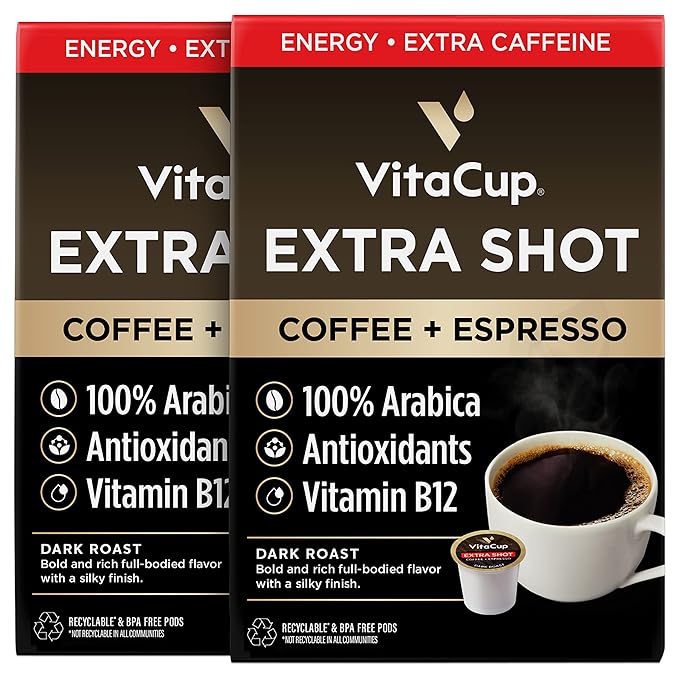 VitaCup Extra Shot Strong Coffee Pods, Bold & Intense Dark Roast w/Espresso Shot, High Caffeine, Vitamin B12, Antioxidants, Recyclable Single Serve Pod Compatible with Keurig K-Cup Brewers, 32ct