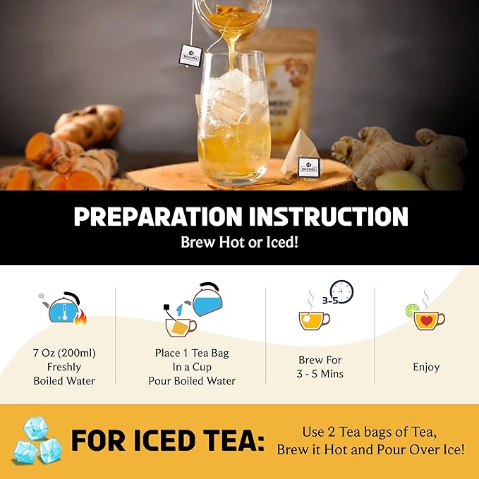 BREWIX, Turmeric Ginger Herbal Tea Bags (20 Pyramid Tea Bags) Real Ingredients From India, Naturally Caffeine Free | Pure Herbal Blend | Packed in Resealable Ziplock Pouch