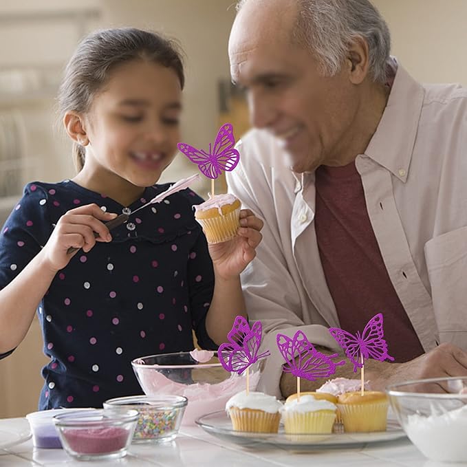 Rsstarxi 24 Pack Butterfly Cupcake Toppers Glitter Assembled Hollow Butterfly Cupcake Picks Baby Shower Cake Decorations for Wedding Engagement Bridal Shower Kids Birthday Party Supplies Purple