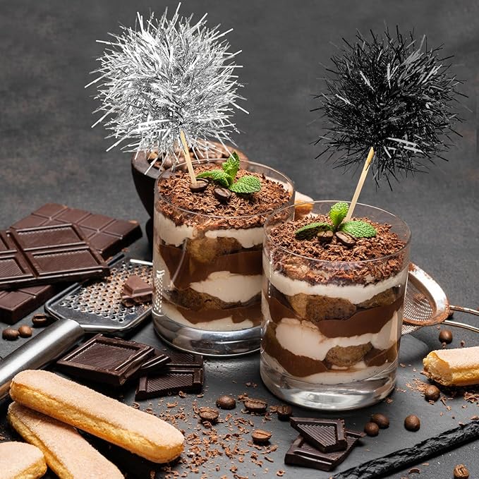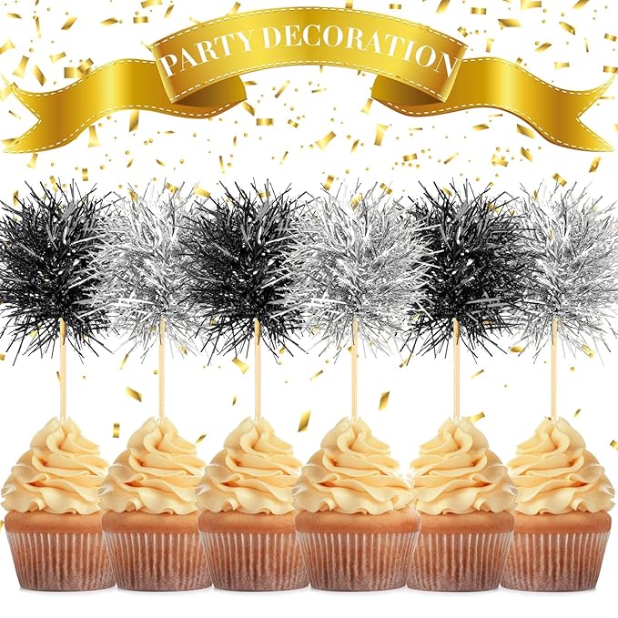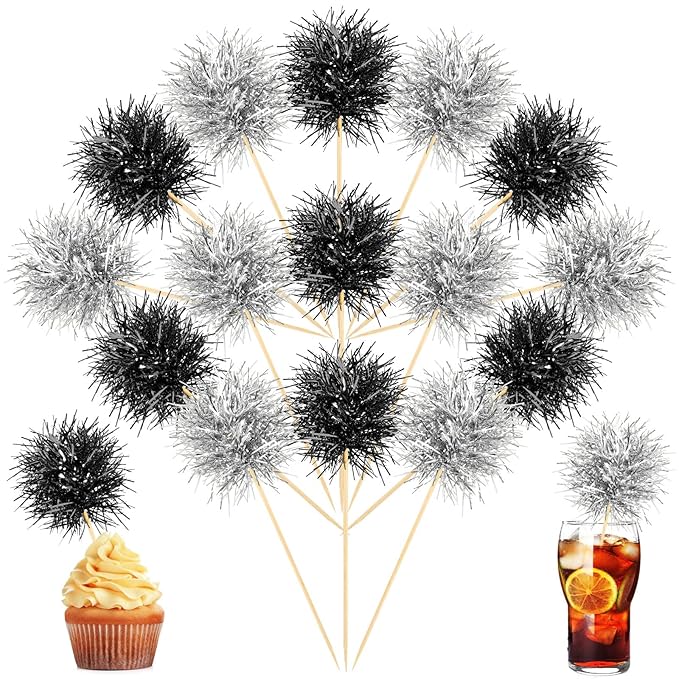 Chinco 100 Pcs Foil Firework Cupcake Toppers Sparkle Tinsel Cake Toppers Cake Decoration Cocktail Fruit Toothpick for Birthday Wedding Graduation Party(Silver, Black)