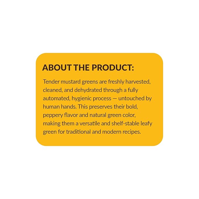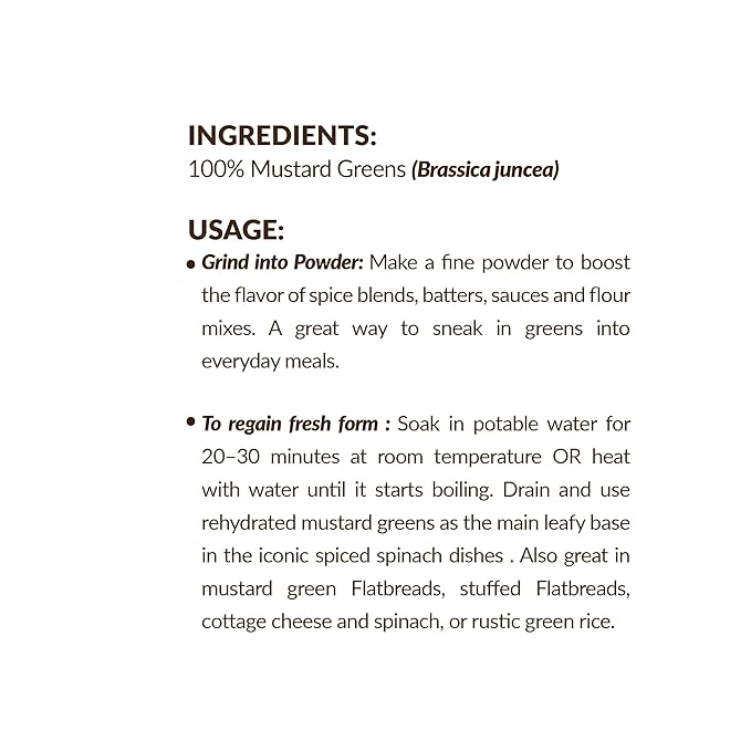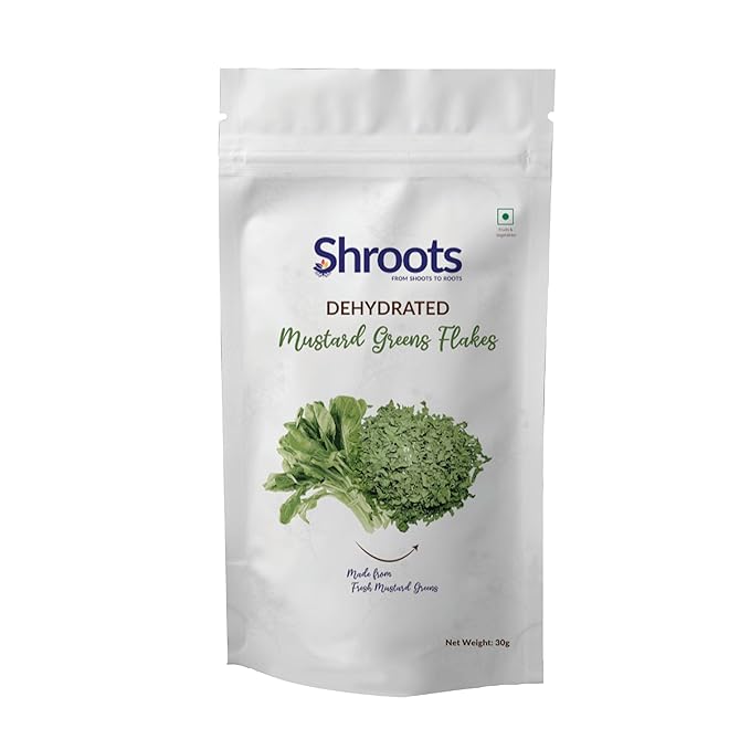 - How Many Serving?: Each 30g (1.06 oz) pack of SHROOTS Dehydrated Mustard Green Leaves (Sarso) Flakes contains approximately 15 servings, with a standard 2g serving size, making it easy to add the right amount to your meals. These ready-to-use flakes are gluten-free, vegan, and contain no added salt or preservatives, offering a pure and healthy choice to enhance your dishes.