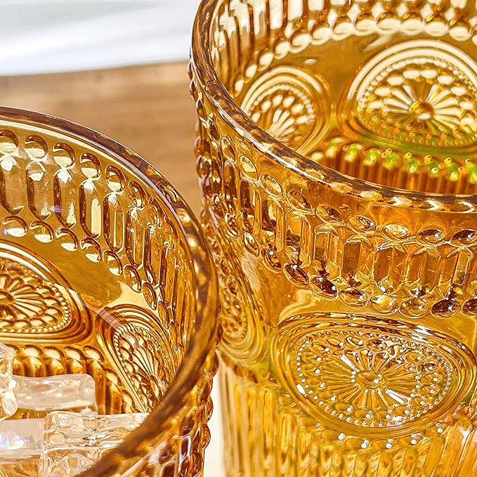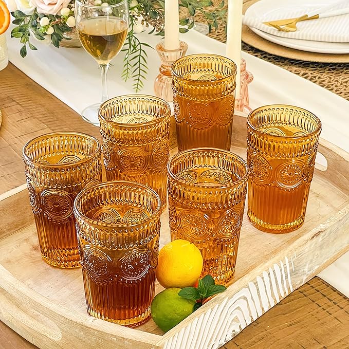 Kate Aspen Vintage Textured Amber Striped Drinking Glasses Set of 6-13 oz Ribbed Glassware with Flower Design | Cocktail Set, Juice Glass, Iced Coffee Cup