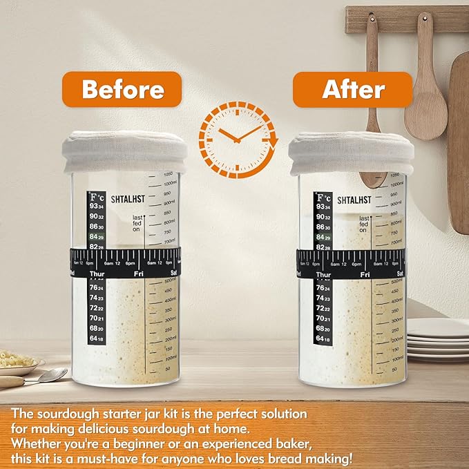 - Sourdough Starter Jar Kit: You will receive a 39 ounce wide mouth sourdough jar, a dough scraper, a thermometer to read the temperature of your sourdough storage container at all times, a feeding band to mark the date, a breathable cloth lid to allow better air in your jar while fermenting, and a stainless steel lid for airtight storage