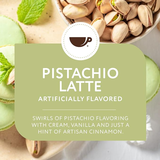 - The perfect iced beverage treat with swirls of dreamy pistacho and sweet vanilla cream with just a hint of artisan vanilla. This coffee is sure to become a favorite.