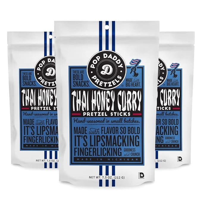 Pop Daddy Flavored Pretzels Sticks, Healthy Gourmet Pretzels Snacks, 7.5oz Individual Bags, 3 Pack, Thai Honey Curry