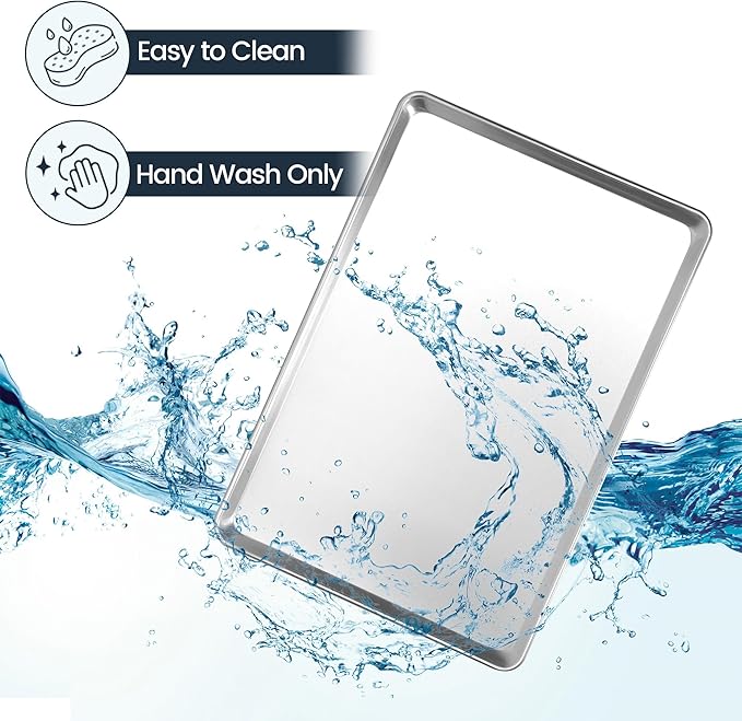 - Easy to Clean: Rectangular aluminum non-stick baking sheet holds food, prevents food juices from flowing everywhere, and keeps the oven tidy. HAND WASH ONLY as discoloration will occur due to the cleaning agents used in automatic dishwasher detergent