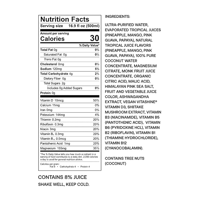 - What We're Made of: Made with organic coconut water, providing natural electrolytes to support and replenish hydration. Enhanced with 12 vitamins and minerals, including Magnesium, B Vitamins, and Vitamin D.