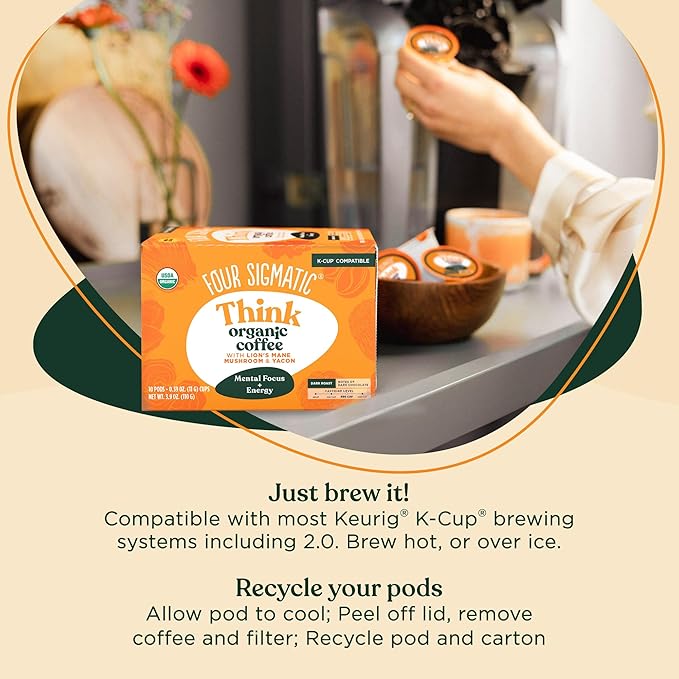 Four Sigmatic Mushroom Coffee K-Cups | Organic Dark Roast Coffee with Lion’s Mane Mushroom Powder & Yacon | Focus & Immune Support | Vegan & Keto | Sustainable Pods | 10 Count