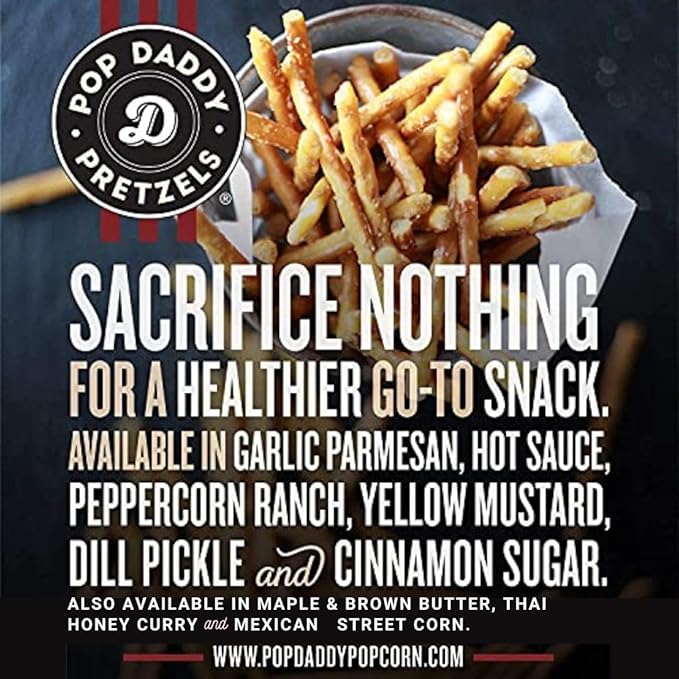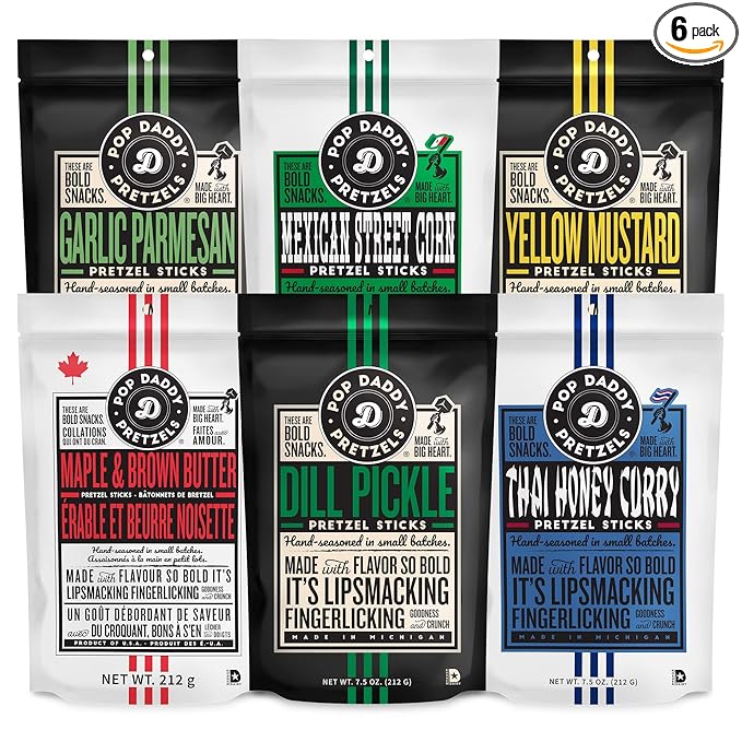 Pop Daddy Flavored Pretzel Sticks, Healthy Gourmet Pretzels, 7.5oz Individual Bags, 6 Pack, Thai Honey Curry, Maple & Brown Butter, Mexican Street Corn, Dill Pickle, Garlic Parmesan, Yellow Mustard
