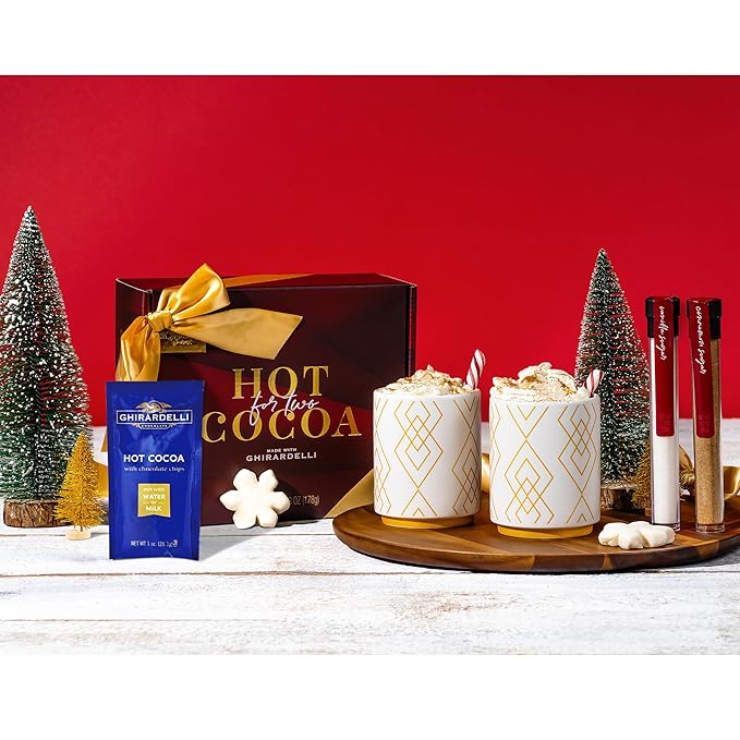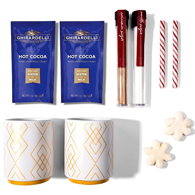 Hot Cocoa for Two Gift Set Made with Ghirardelli, Includes 2 Mugs, 2 Hot Cocoa Mixes, 2 Sugar Toppings, 2 Peppermint Stirrers & 2 Snowflake Marshmallows