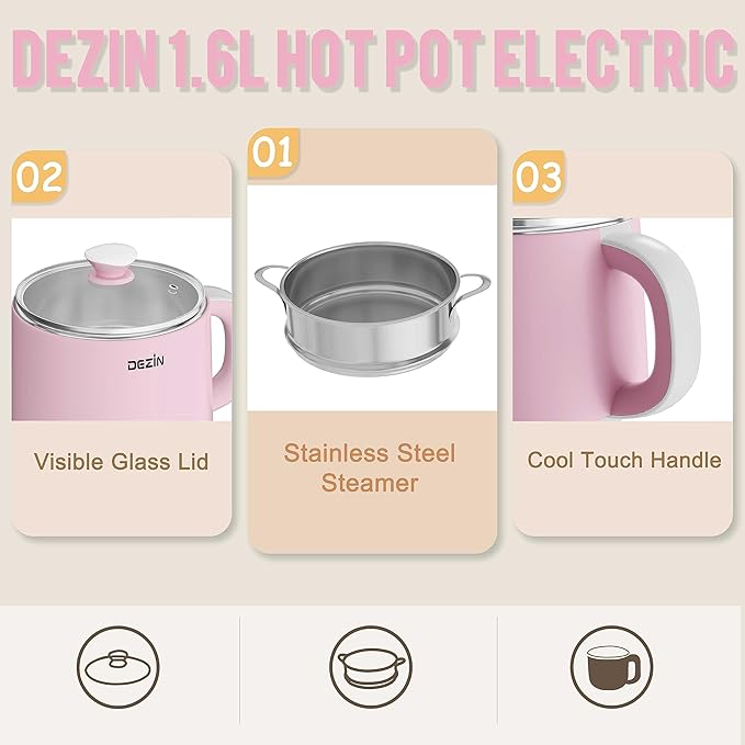 Dezin Electric Pot with Steamer, Hot Pot Electric 1.6L, Stainless Steel Cooker for Ramen, Egg, Dumpling, Soup, Oatmeal with Temperature Control and Keep Warm Function, Pink