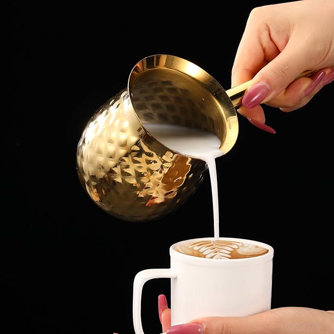 - 【Design】This Turkish coffee pot has a special hammered exterior design with a scald-resistant lid and long handle. The unique angle of the handle provides a comfortable grip, while the convenient spout allows for effortless pouring.