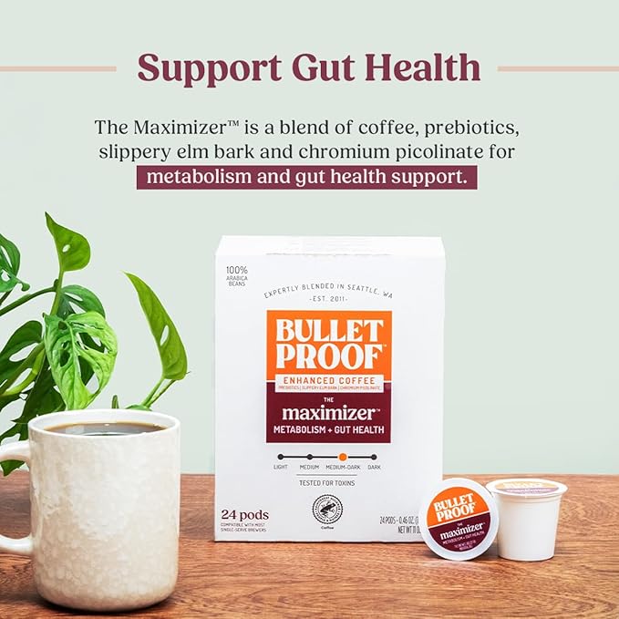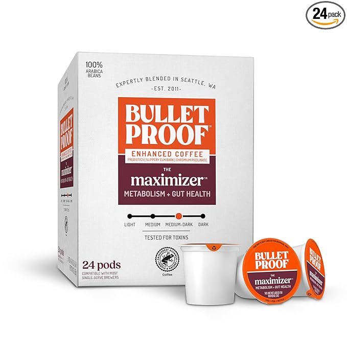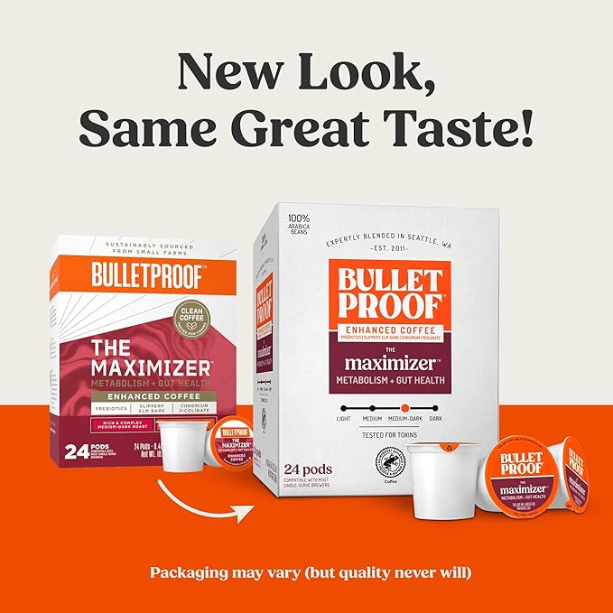 - Unbeatable Taste: Contains one 24-count box of The Maximizer functional coffee pods, an adaptogenic coffee with prebiotics, slippery elm bark and chromium picolinate, Packaging May Vary