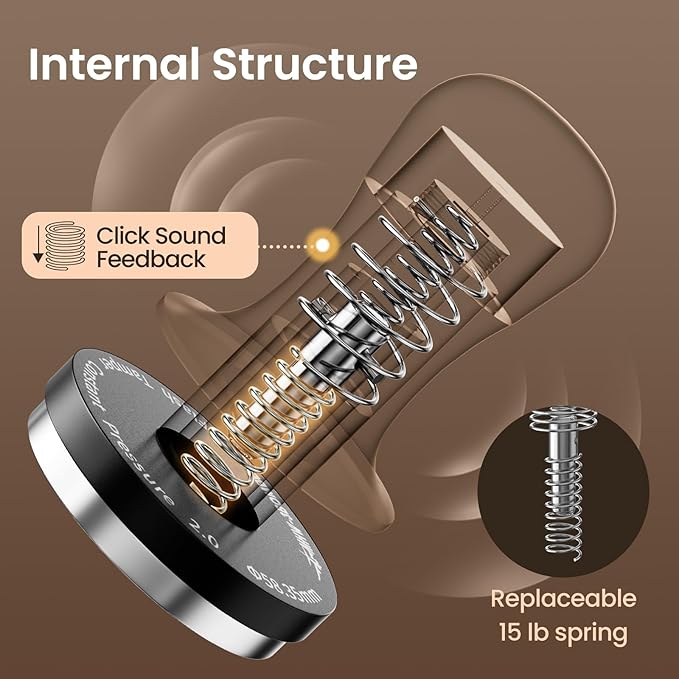 - Tamper With Three Springs: The espresso tamper 54mm uses an original three-spring design, which not only maintains a constant pressure of 30lbs, but also provides sound feedback.